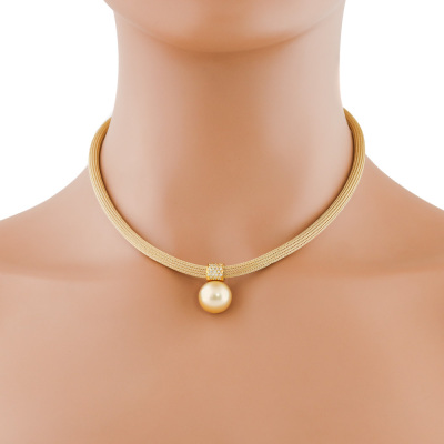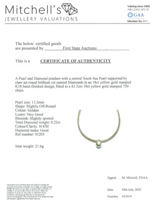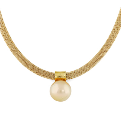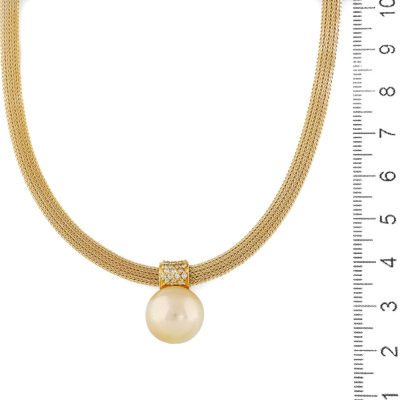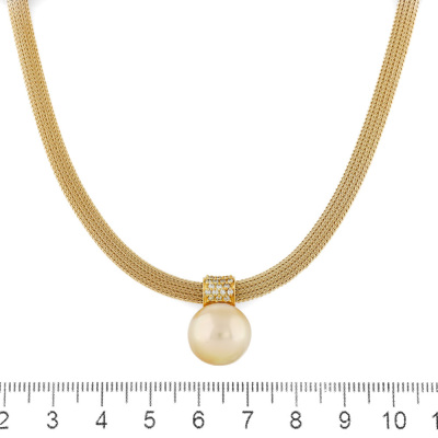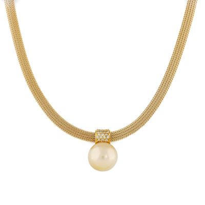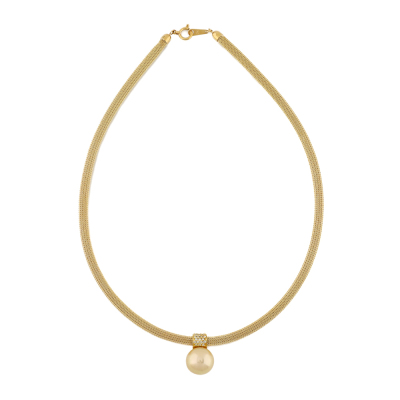 Pearl and Diamond pendant with a Golden South Sea Pearl of 13.2mm and round Natural Diamonds totalling 0.22ct. 18ct yellow gold with 41.5cm 18ct yellow gold round hollow mesh chain. Width of chain: 4.5mm. Weight: 21.6g. With Certificate #421019. (Pre-owned)