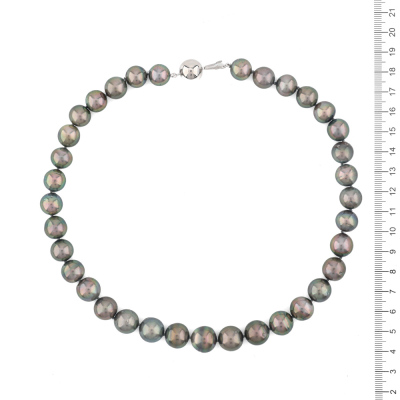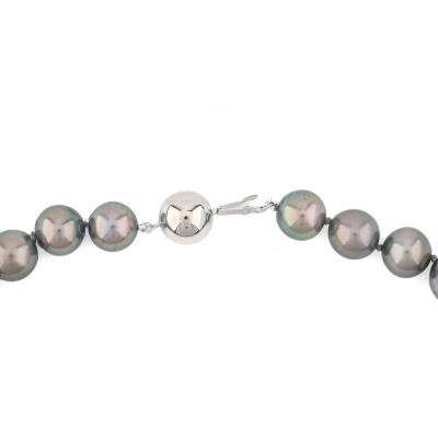 Pearl necklace with 35 graduated Tahitian Pearl from 13.3mm - 11mm. 14ct white gold 12mm ball clasp. Length: 44.5cm. Weight: 79.2g. (As New)