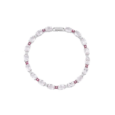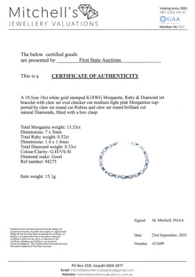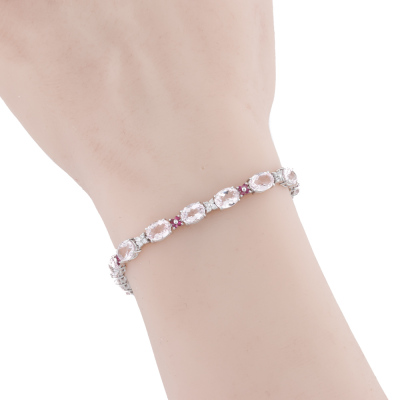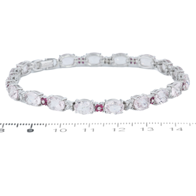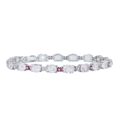 Morganite, Ruby and Diamond bracelet with oval shape Natural Morganite totalling 13.33ct, round Natural Ruby totalling 0.52ct and round Natural Diamonds totalling 0.33ct (Estimated grading: G-H VS-SI). 18ct white gold. Length: 19.5cm. Weight: 15.1g. With Certificate #421609. (Pre-owned)