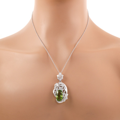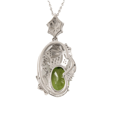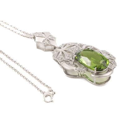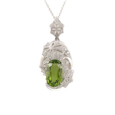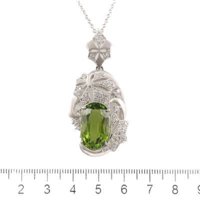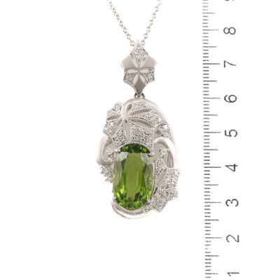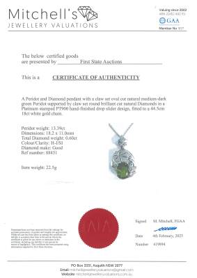 Peridot and Diamond pendant with oval shape Natural Peridot of 13.39ct and round Natural Diamonds totalling 0.60ct (Estimated grading: H-I SI). Platinum - 900 and 44.5cm 18ct white gold chain. Weight: 22.5g. With Certificate #419894. (Pre-owned)