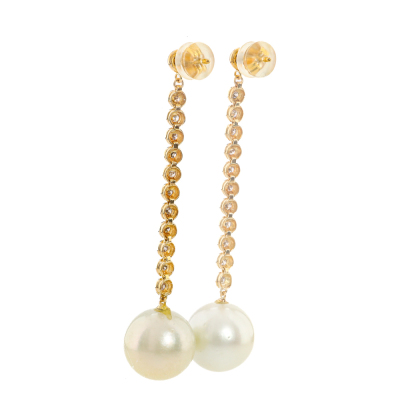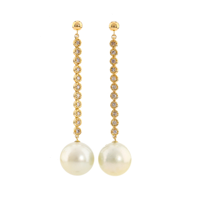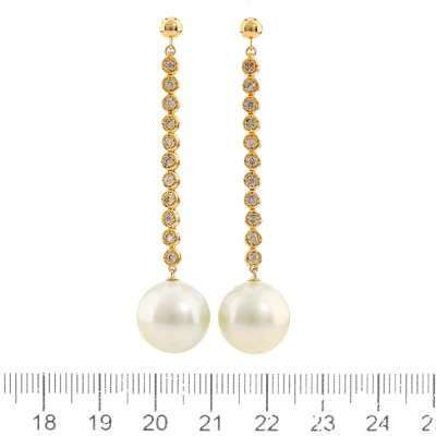 Pearl and Diamond drop earrings with South Sea Pearl of 13.3mm & 13.1mm and round Natural Diamonds totalling 0.44ct (Estimated grading: IJK SI). 18ct yellow gold with 18ct yellow gold & silicon backs. Drop length: 5.8cm. Weight: 10.1g. (Pre-owned)