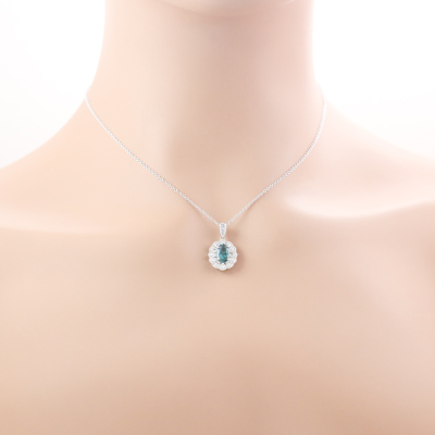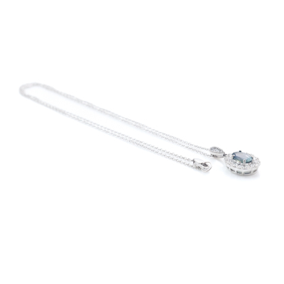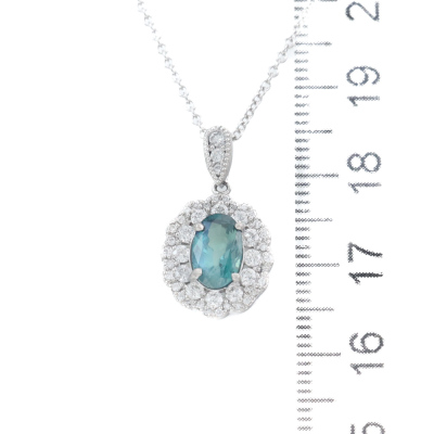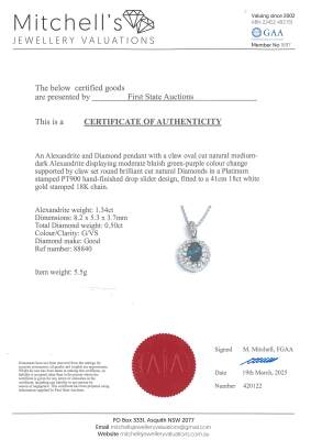 Alexandrite and Diamond pendant with oval shape Natural Alexandrite of 1.34ct (Moderate colour changing from Bluish Green to Purple) and round Natural Diamonds totalling 0.50ct (Estimated grading: G VS). Platinum-900 with 18ct white gold 41cm chain. Weight: 5.5g. With Certificate #420112. (Pre-owned)