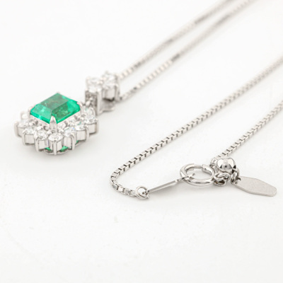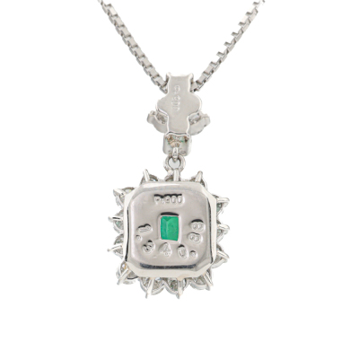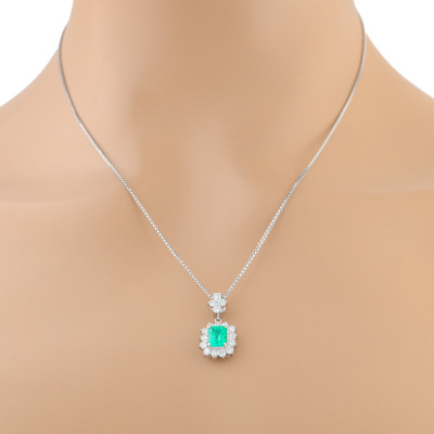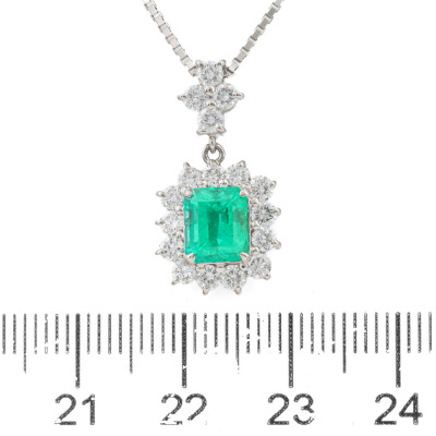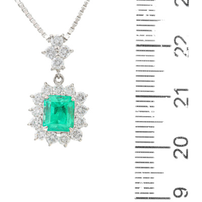 Emerald and Diamond pendant with centre emerald cut Natural Emerald of 1.34ct and round Natural Diamonds totalling 0.88ct (Estimated grading: G SI). Platinum - 900 with 45cm Platinum - 850 adjustable chain. Weight: 8.1g. (Pre-owned)