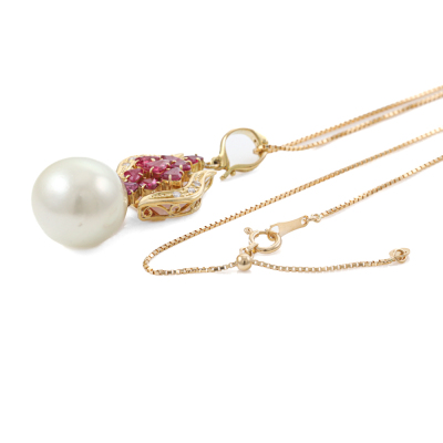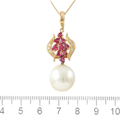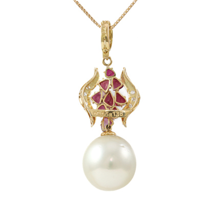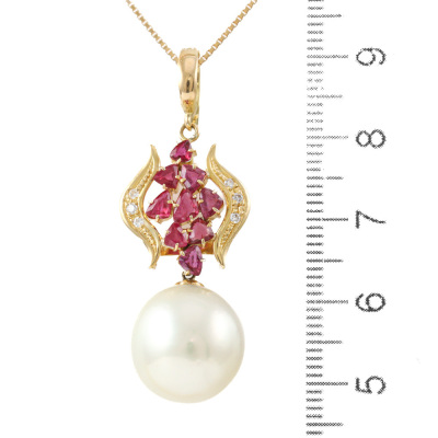 Pearl, Ruby and Diamond enhancer/pendant with a South Sea Pearl of 13.4mm, trilliant cut Natural Rubies totalling 1.36ct and round Natural Diamonds totalling 0.06ct. 18ct yellow gold with 45cm 18ct yellow gold adjustable chain. Weight: 8.5g. (Pre-owned)