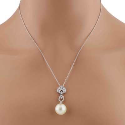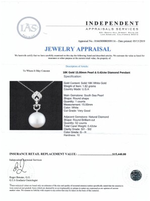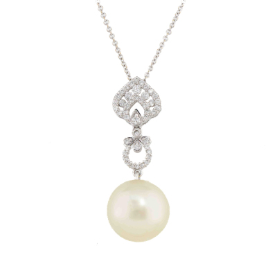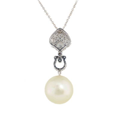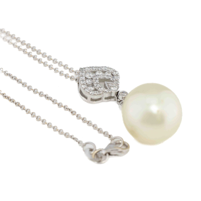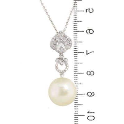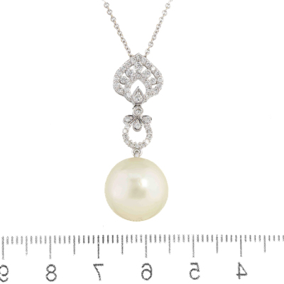 Pearl and Diamond pendant with a South Sea Pearl of 13.4mm and round Natural Diamonds totalling 0.42ct (Estimated grading: G-H SI2). 18ct white gold with 45cm 18ct white gold chain. Weight: 7.4g. With Valuation Certificate dated 05/13/19. (Pre-owned)