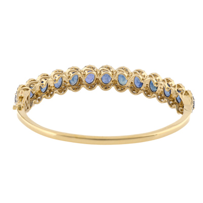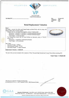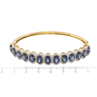 Sapphire and Diamond bangle with 13 oval shape Natural Blue Sapphires totalling approximately 13.52ct and round Natural Diamonds totalling 2.07ct (Estimated grading: G VS-SI). 14ct yellow gold with white rhodium plating. Circumference: 16.5cm. Weight: 19.0g. With Valuation dated 19/08/2021.