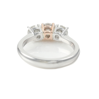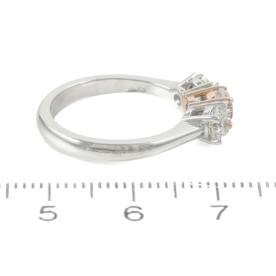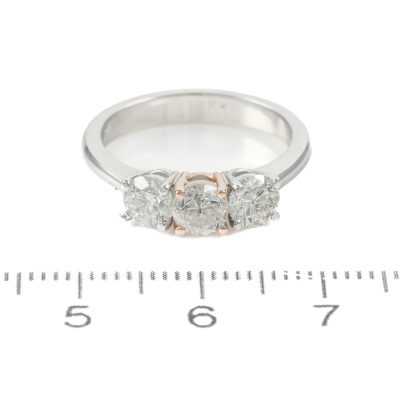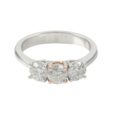 Diamond trilogy ring with centre round brilliant cut Natural diamond of 0.55ct (Estimated grading: G-H SI) and 2 round Natural Diamonds totalling 0.80ct (with copy of GIA Dossier Reports graded as G P1 #6351647492, 7403932867). 18ct white and rose gold. Ring Size: K1/2. Weight: 4.6g. (new)