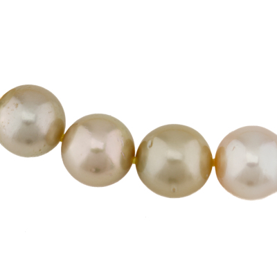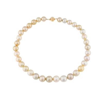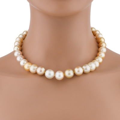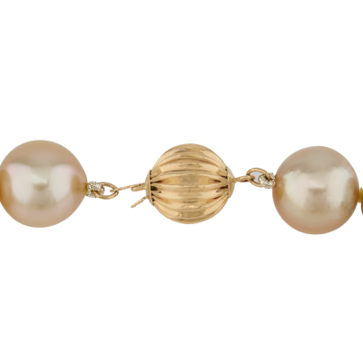 Pearl strand necklace with 34 Graduated Golden and Cream South Sea Pearls of 13.6mm - 10.7mm. 18ct yellow gold 10mm ball clasp. Length: 45.5cm. Weigt: 89.6g.