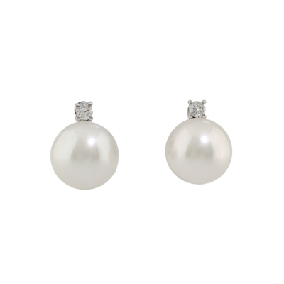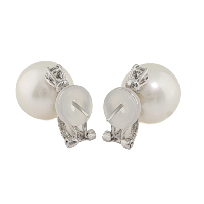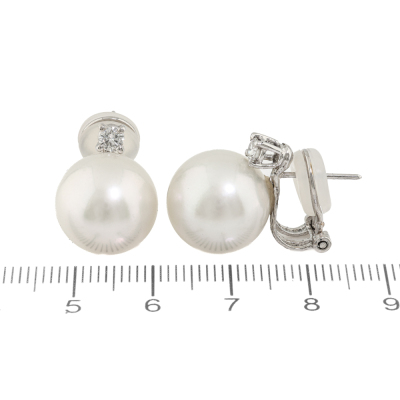 Clip-on earrings (for pierced ears) with South Sea Pearls of 13.6mm & 13.3mm and 2 round Natural Diamonds totalling 0.24ct. 14ct white gold with Platinum 850 posts. Weight: 10.3g.