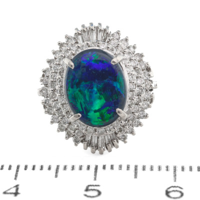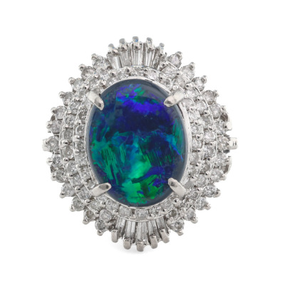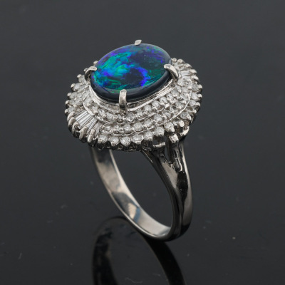 Opal and Diamond ring with oval cabochon cut solid Natural Black Opal of 1.36ct and round & baguette cut Natural Diamonds totalling 0.53ct (Estimated grading: H-I SI-P1). Platinum - 900. Ring size J. Band width: 2.2mm - 3.2mm. Weight: 7.0g. (Pre-owned)