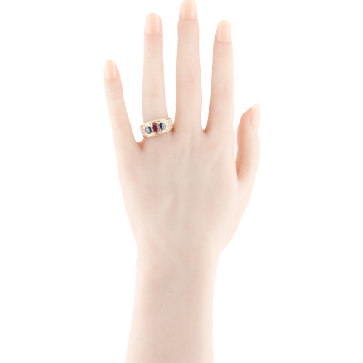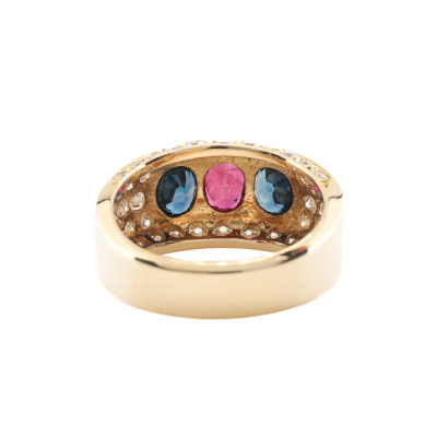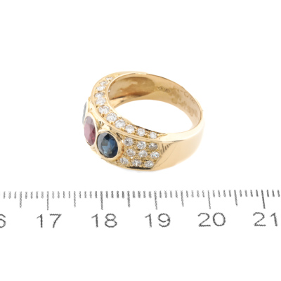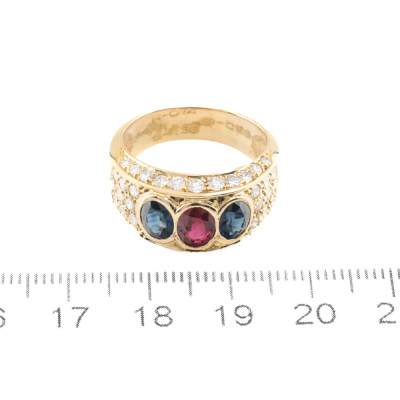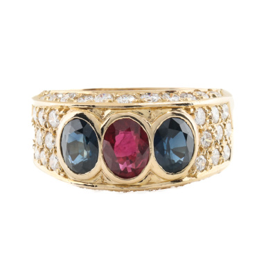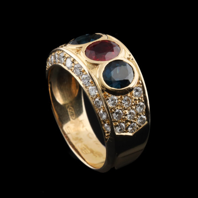 Sapphire, Ruby and Diamond ring with oval shape Natural Blue Sapphires totalling 1.36ct, oval shape Natural Ruby of 0.74ct and round Natural Diamonds totalling 0.96ct (Estimated grading: H-I SI). 18ct yellow gold. Ring size O1/2. Band width: 5.3mm - 6.6mm. Weight: 7.8g. (Pre-owned)