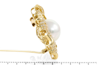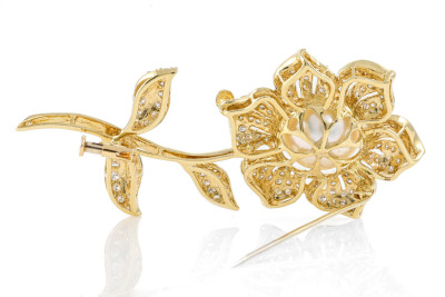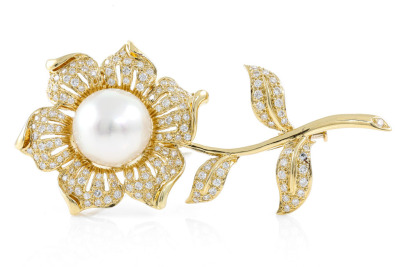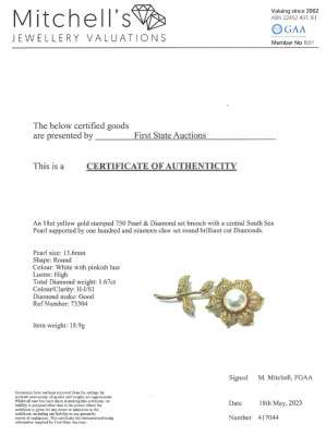 Pearl and Diamond flower design brooch/pendant with South Sea Pearl of 13.6mm and round Natural Diamonds totalling 1.67ct (Estimated grading: H-I SI). 18ct yellow gold. Weight: 18.9g. With Certificate #417044. (Pre-owned)