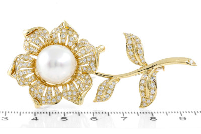 13.6mm Pearl and 1.67ct Diamond Flower Brooch