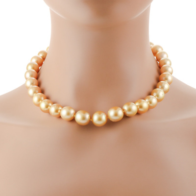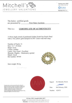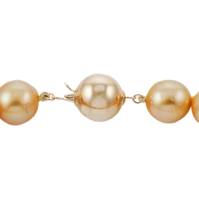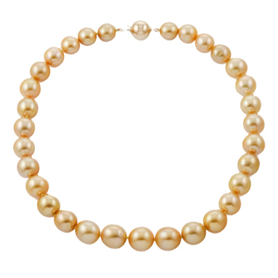 Pearl strand necklace with 31 graduated Golden South Sea Pearls from 13.7mm - 10.6mm. 14ct yellow gold 12mm ball clasp. Length: 44cm. Weight: 90.2g. With Certificate #422473.