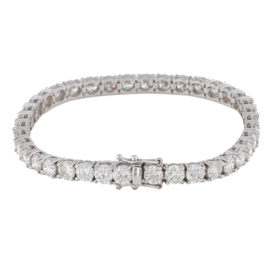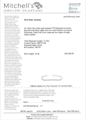 Diamond tennis bracelet with 38 round natural Diamonds totalling 13.78ct (Estimated grading: GHI VS-SI). 18ct white gold. Length: 18cm. Weight: 16.2g. With Valuation Certificate #422579.