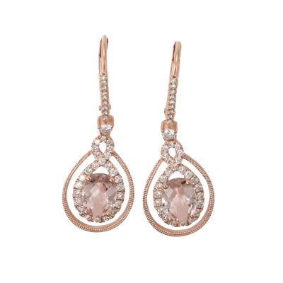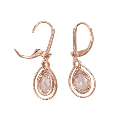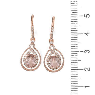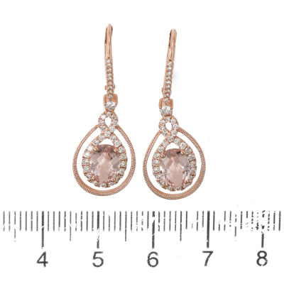 Morganite and Diamond leverback drop earrings with oval shaped natural Morganite totalling 1.37ct and round natural Diamonds totalling 0.48ct (Estimated grading: H SI). 14ct rose gold. Weight: 2.9g. (New)