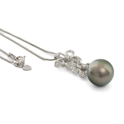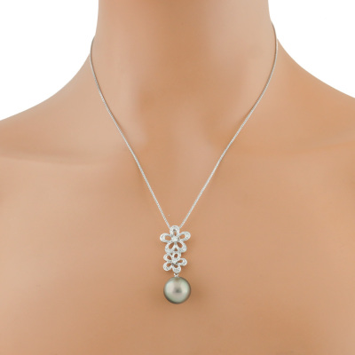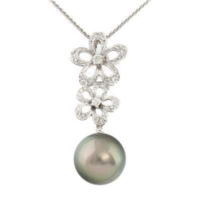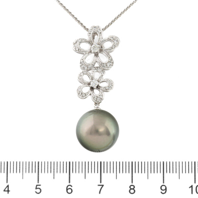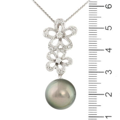 Pearl and Diamond pendant with a Tahitian Pearl of 13.7mm and round Natural Diamonds totalling 0.33ct (Estimated grading: H-I SI). Pendant length: 4cm. 18ct white gold with 45.5cm 18ct white gold adjustable chain. Weight: 10.0g. (Pre-owned)