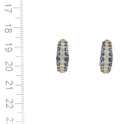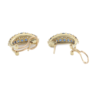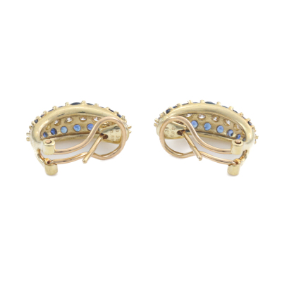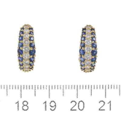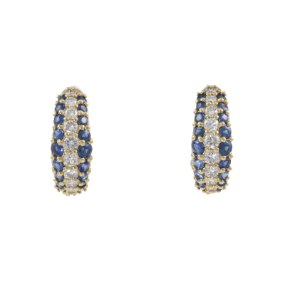 Clip-on earrings (for both pierced and non-pierced ears) with round Natural Blue Sapphires totalling 1.38ct and round Natural Diamonds totalling 0.76ct (Estimated grading: H VS). 18ct yellow gold. Weight: 6.8g. (Pre-owned)