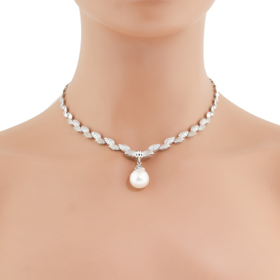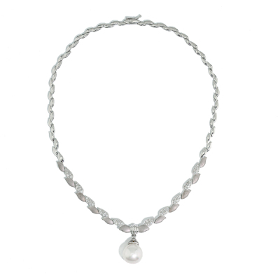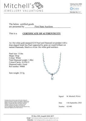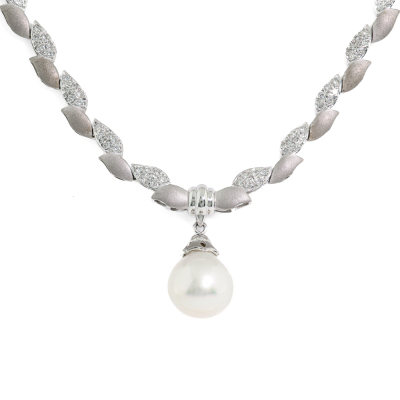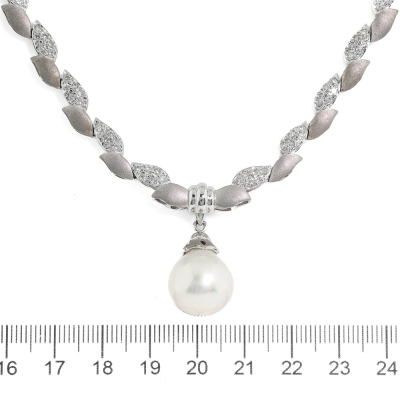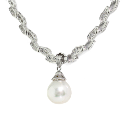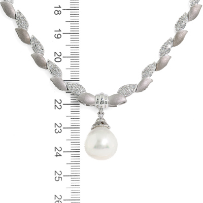 Pearl and Diamond necklace with a detachable South Sea Pearl of 13.8mm and round Natural Diamonds totalling 1.00ct (Estimated grading: H-I SI-P1). 18ct white gold. Length: 41cm. Weight: 23.5g. With Certificate #421480. (Pre-owned)