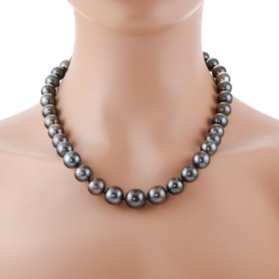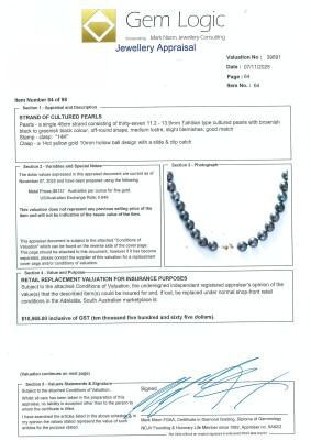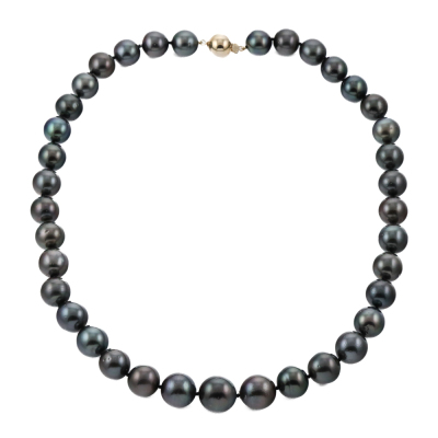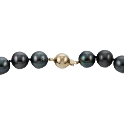 Pearl strand necklace with 37 graduated Tahitian Pearls from 13.9mm - 11.2mm. With 14ct yellow gold ball clasp. Length: 48cm. Weight: 88.2g. With Valuation Certificate dated 07/11/2025. (Pre-owned)
