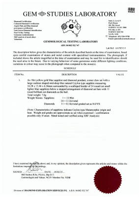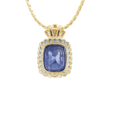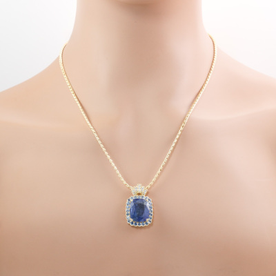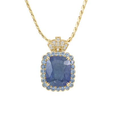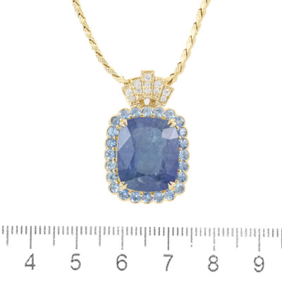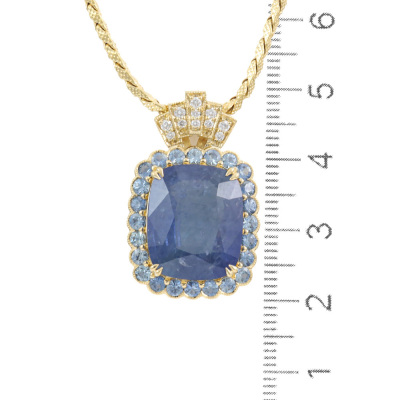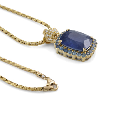 Sapphire and Diamond pendant with centre cushion cut Natural Ceylon Blue Sapphire of 13.90ct, surrounding 24 round Natural Blue Sapphires totalling 2.12ct and 11 round Natural Diamonds totalling 0.14ct. 18ct yellow gold with 50cm 18ct yellow gold chain. Weight: 13.9g. With GSL Description Report #AA70315/1. (Pre-owned)