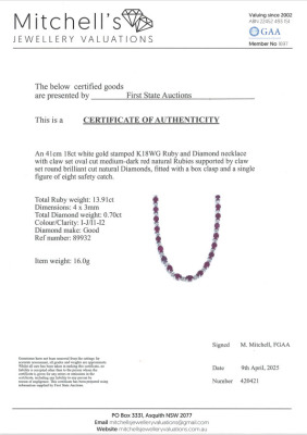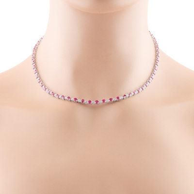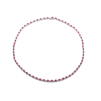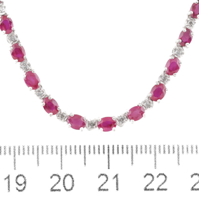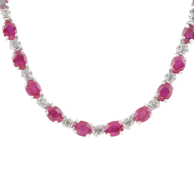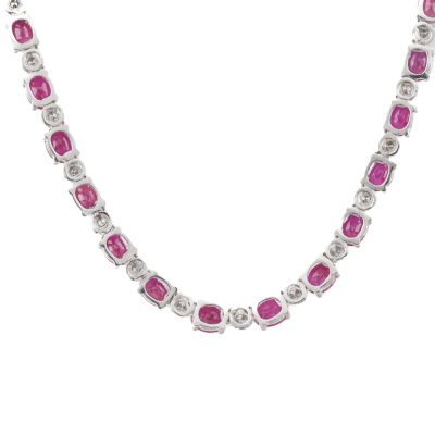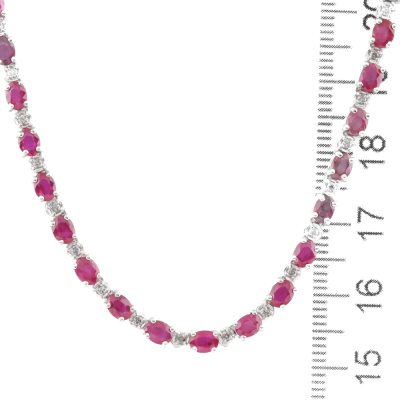 Ruby and Diamond necklace with oval shape Natural Rubies totalling 13.91ct and round Natural Diamonds totalling 0.70ct (Estimated grading: I-J P1-P2). 18ct white gold. Length: 41cm. Weight: 16.0g. With Certificate #420421. (Pre-owned)