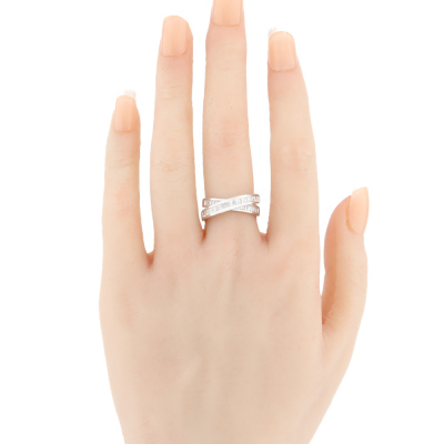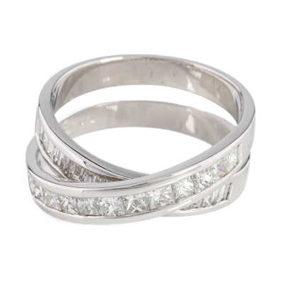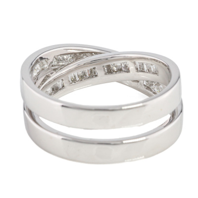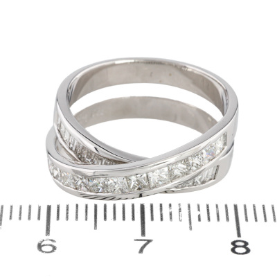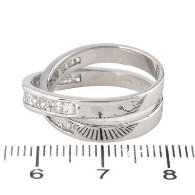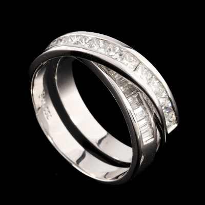 Crossover ring set with princess & baguette cut Natural Diamond totalling 1.39ct (Estimated grading: GHI VS-SI). 18ct white gold. Ring size N1/4. 2 bands, each band width: 3.8mm. Weight: 6.4g. (As new)