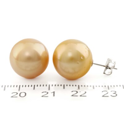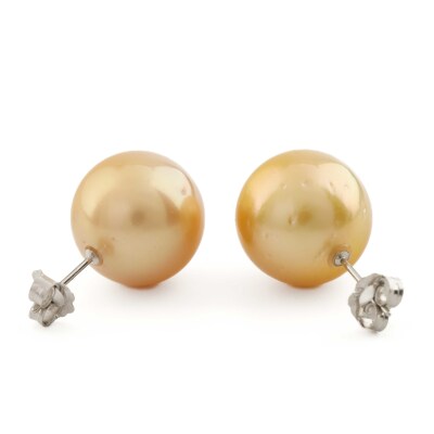 Pearl stud earrings with golden South Sea Pearl approximately of 13.9mm. Platinum - 900 with 18ct white gold backs. Weight: 8.0g. (Pre-owned)