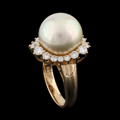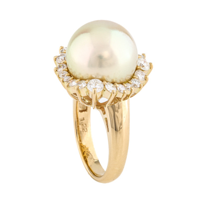 Pearl and Diamond ring with centre light Golden South Sea Pearl of 13.9mm and round Natural Diamonds totalling 1.22ct (Estimated grading: G VS). 18ct yellow gold. Band Width: 3.3mm - 4.2mm