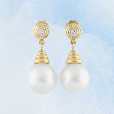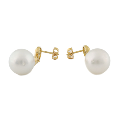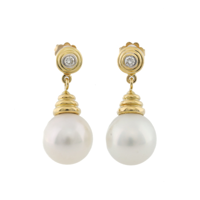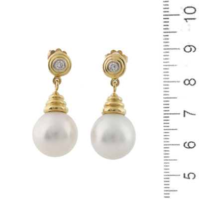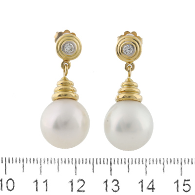 Pearl and Diamond earrings with South Sea Pearls of 13.9mm and round Natural Diamonds totalling approximately 0.20ct. 18ct yellow gold with 18ct yellow gold backs. Weight: 15.2g. (Pre-owned)