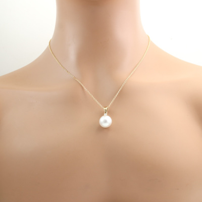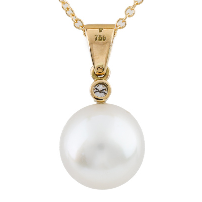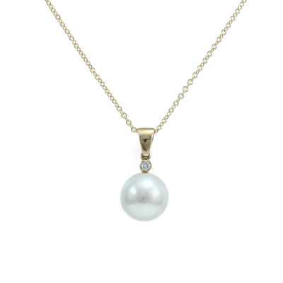 Pearl and Diamond pendant with button shape South Sea Pearl of 13mm and a round Natural Diamond of approximately 0.06ct. Stamped 'P'. 18ct yellow gold with 45.5cm 18ct yellow gold chain. Weight: 6.6g. (Pre-owned)