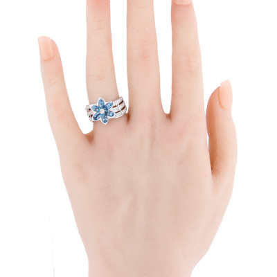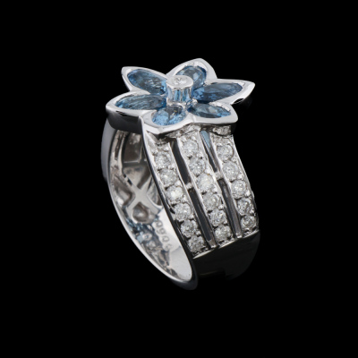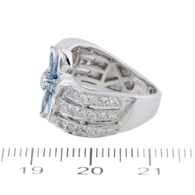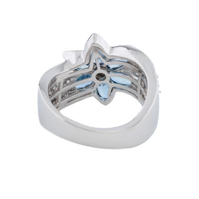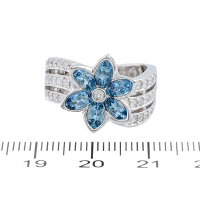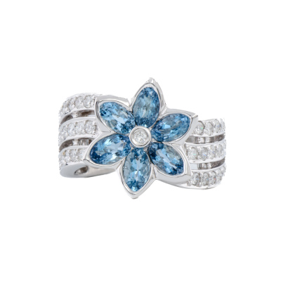 Flower design ring with 6 oval shape Natural Aquamarines totalling 1.40ct and round Natural Diamonds totalling 0.60ct (Estimated grading: G-H SI). 18ct white gold. Ring size L. Band width: 4mm - 7mm. Weight: 7.0g. (Pre-owned)