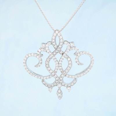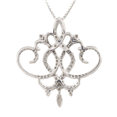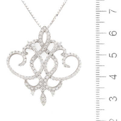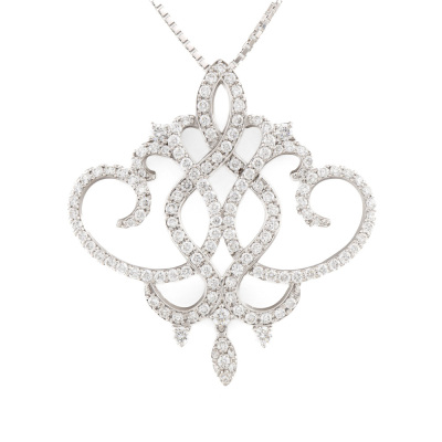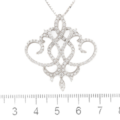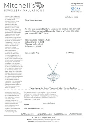 Diamond dress pendant with round Natural Diamonds totalling 1.40ct (Estimated grading: G-H SI). 18ct white gold and 18ct white gold 44.5cm chain. Weight: 9.7g. With Valuation Certificate #420749. (pre-owned)