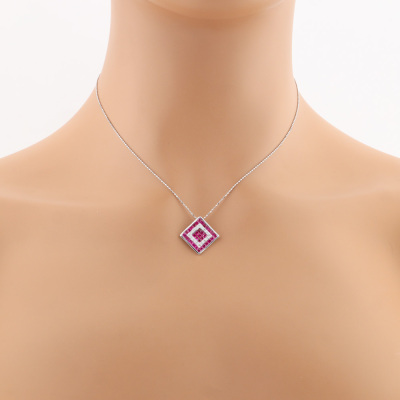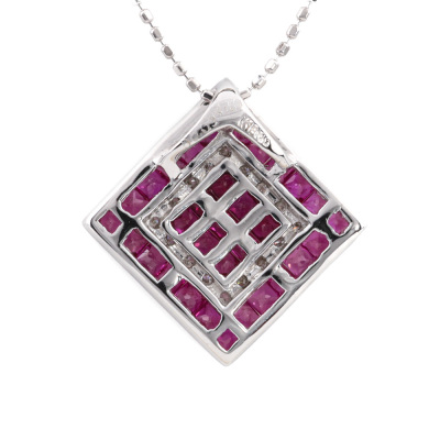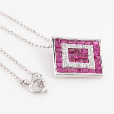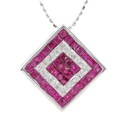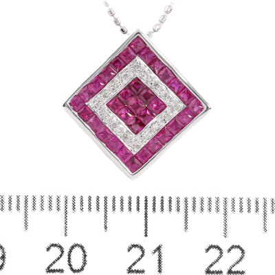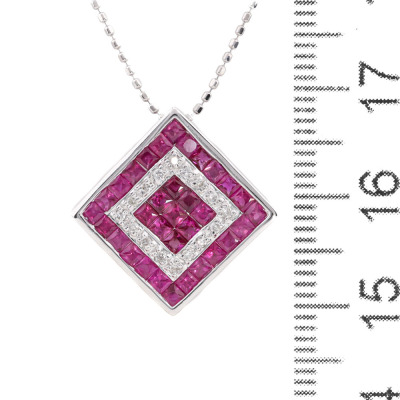 Ruby and Diamond pendant with carre cut Natural Rubies totalling 1.40ct and round Natural Diamonds totalling 0.09ct. 18ct white gold with 18ct white gold chain. Length: 35cm -39cm. Weight: 3.8g (Pre-owned)