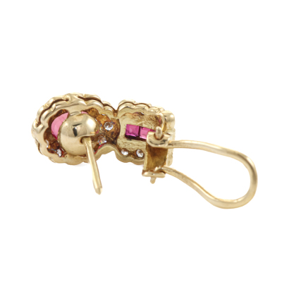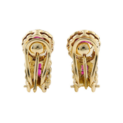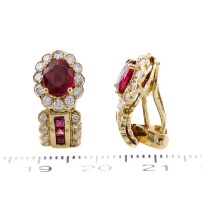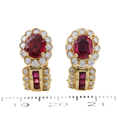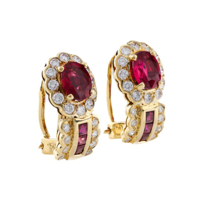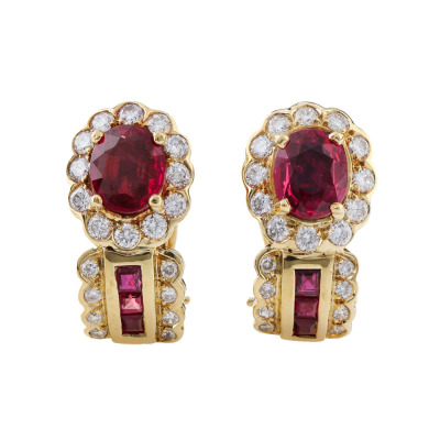Ruby and Diamond clip-on earrings (for pieced & non pieced ears) with oval & carre cut Natural Rubies totalling approximately 1.40ct and round Natural Diamonds totalling approximately 0.60ct (Estimated grading: G-H SI). 18ct yellow gold. Weight: 6.2g. (Pre-owned)