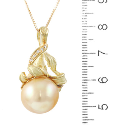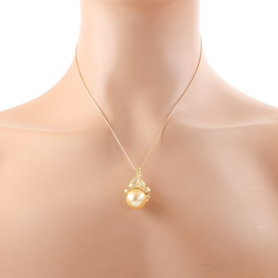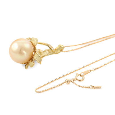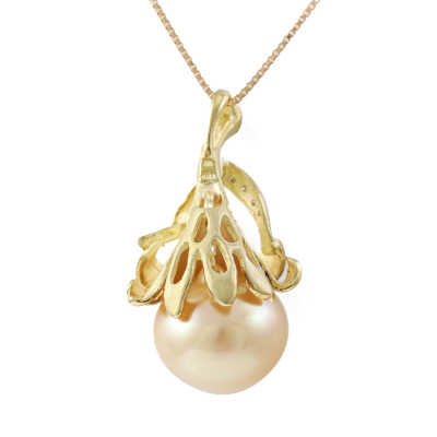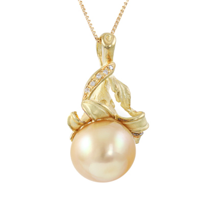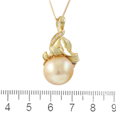 Botanical design pendant with a Golden South Sea Pearl of 14.0mm and 5 round Natural Diamonds totalling 0.04ct. 18ct yellow gold with 45cm 18ct yellow gold adjustable chain. Weight: 11.7g. (Pre-owned)