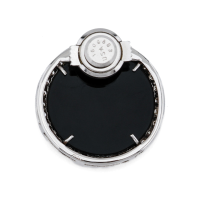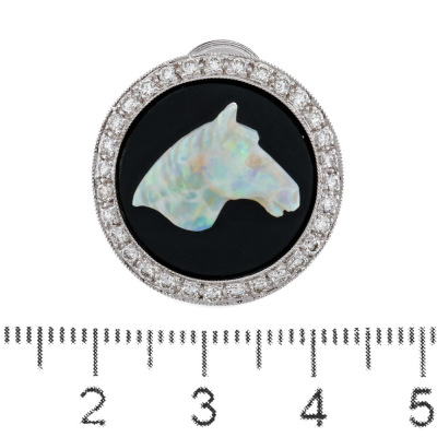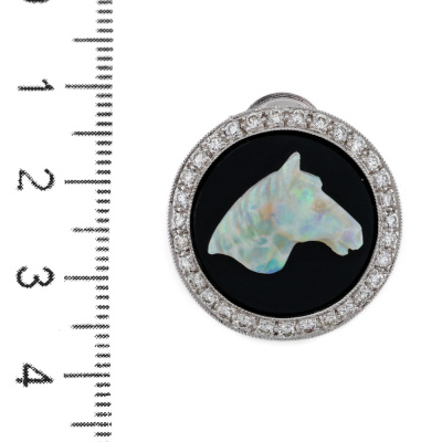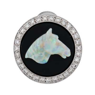 Opal & Diamond brooch with carved horse head Solid White Opal of 14.11ct, round Onyx inlay and round Natural Diamonds totalling 0.57ct (Estimated grading: G VS). 18ct white gold. Diameter: 2.2cm. Weight: 7.9g.