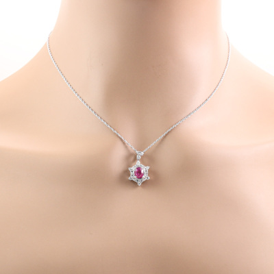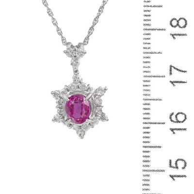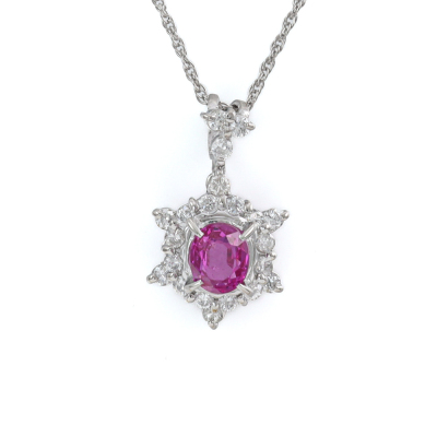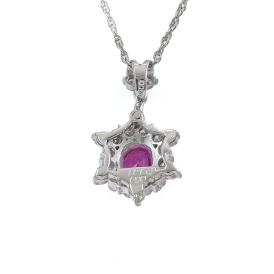 Ruby and Diamond pendant with oval shape Natural Ruby of 1.41ct and round Natural Diamonds totalling 0.54ct (Estimated grading: H-I SI). Platinum - 900 with 41cm Platinum - 850 adjustable chain. Weight: 5.5g. (Pre-owned)