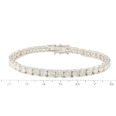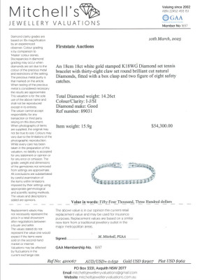 Diamond tennis bracelet with 38 round Natural Diamonds totalling 14.26ct (Estimated grading: I-J SI). 18ct white gold. Length: 18cm. Weight: 15.9g. With Valuation Certificate #420067. (New)