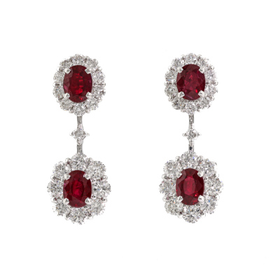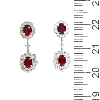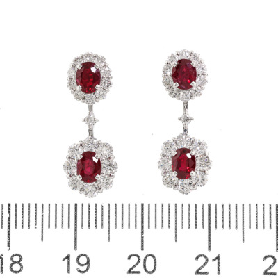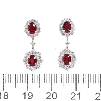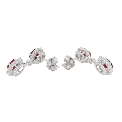 Ruby and Diamond drop earrings with oval shape Natural Rubies totalling 1.42ct and round Natural Diamonds totalling 1.22ct (Estimated grading: G-H SI-P1). Platinum - 900 with 18ct white gold backs. Length: 2.1cm. Weight: 4.8g. (Pre-owned)