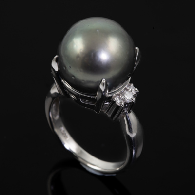 Pearl and Diamond ring with Tahitian Pearl of 14.2mm and round Natural Diamonds totalling 0.16ct. Platinum 900. Ring size N. Band width: 2.7mm - 3.9mm. Weight: 13.1g. (Pre-owned)