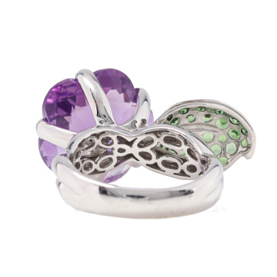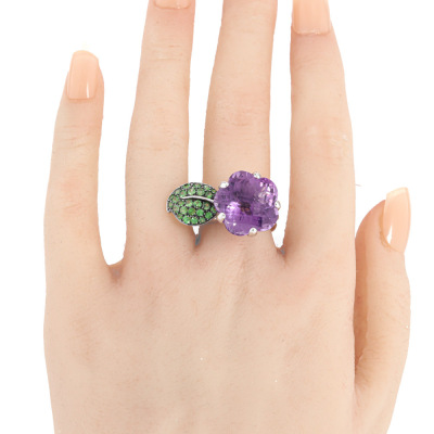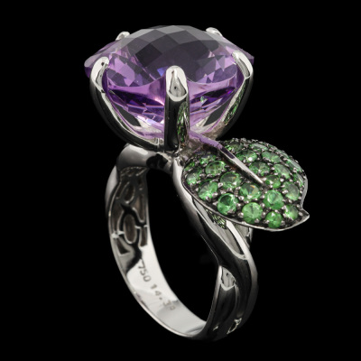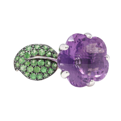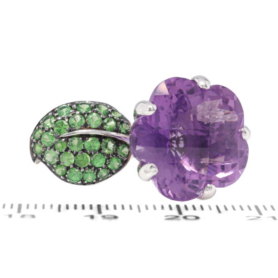 Flower and leaf design ring with a fancy checkerboard cut Natural Amethyst of 14.39ct and round Natural Tsavorite totalling approximately 1.35ct. 18ct white gold with black rhodium plating. Ring size: N. Band width: 3.9mm-5.1mm. Weight: 11.5g.