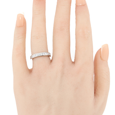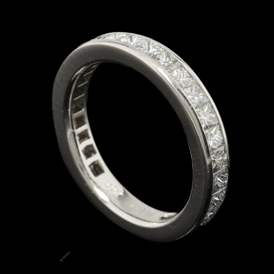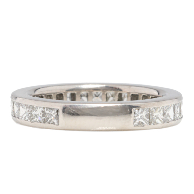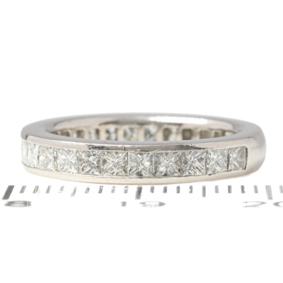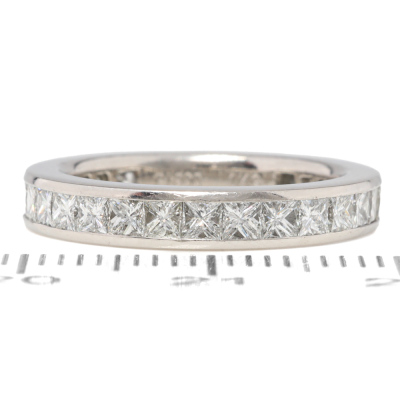 Diamond eternity ring with princess cut Natural Diamonds totalling 1.43ct (Estimated grading: H-I SI). Platinum - 900. Ring size J - ring resizing is not recommended. Band width: 3.3mm. Weight: 5.2g. (Pre-owned)