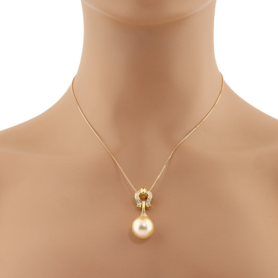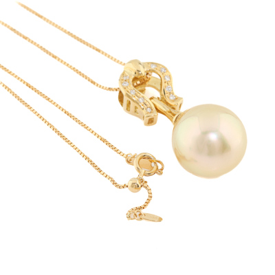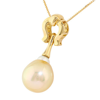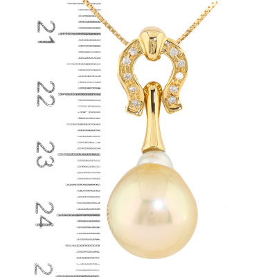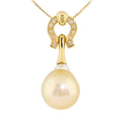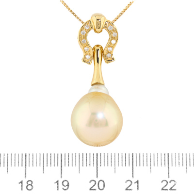 Horseshoe design pendant with drop shape Golden South Sea Pearl of 14.3mm and round Natural Diamonds totalling 0.10ct. 18ct yellow gold with 45cm 18ct yellow gold adjustable chain