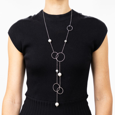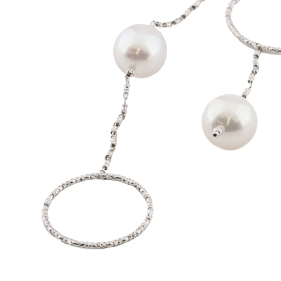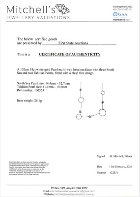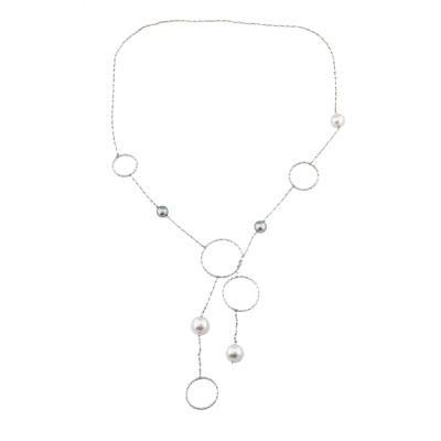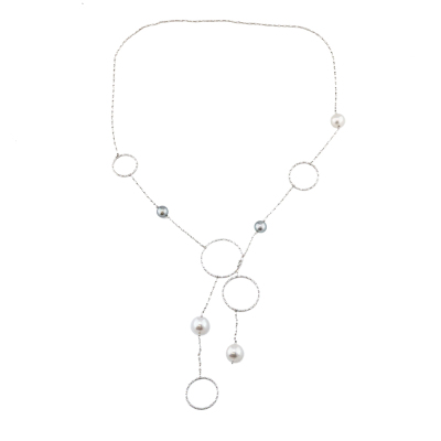 Pearl multi-way Lariat necklace with 3 South Sea Pearls of 14.4mm & 12.7mm and 2 Tahitian Pearls of 11.1mm & 10.5mm. 18ct white gold. Length of the necklace: 102cm. Clasp-free design for effortless wear. Weight: 26.1g. With Certificate #422551.