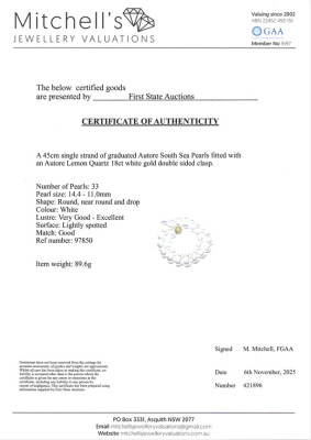 Pearl Strand Necklace with 33 graduated round, near round and drop shape South Sea Pearls of 14.4mm - 11.0mm. With Lemon Quartz 18ct yellow gold double sided clasp. Length: 45cm. Weight: 89.6g. With Certificate #421896.