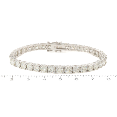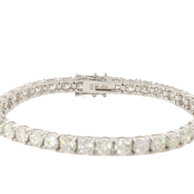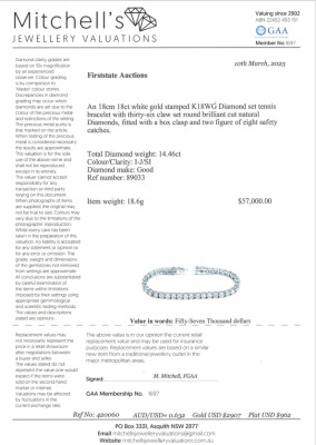 Diamond tennis bracelet with 36 round Natural Diamonds totalling 14.46ct (Estimated grading: I-J SI). 18ct white gold. Length: 18cm. Weight: 18.6g. With Valuation Certificate #420060. (New)