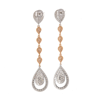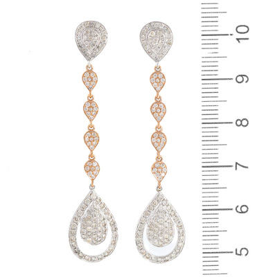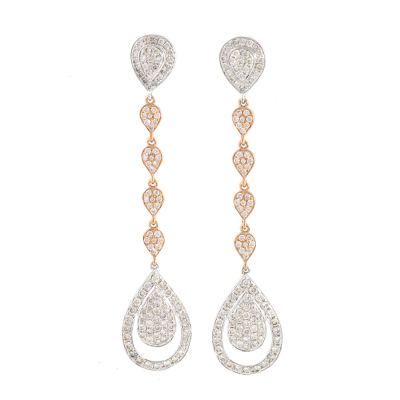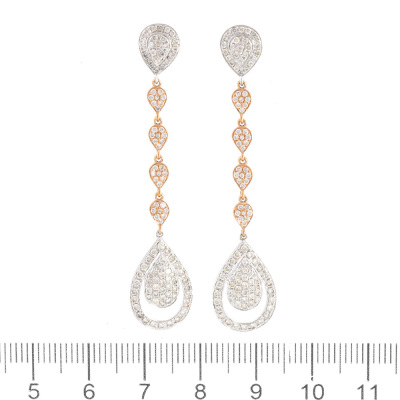 Diamond dangle earrings with 218 round Natural Diamonds totalling 1.44ct (Estimated grading: HIJ SI) 14ct white and rose gold with 14ct white gold backs. Drop length: 5.5cm. Weight: 4.1g.