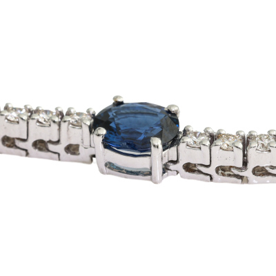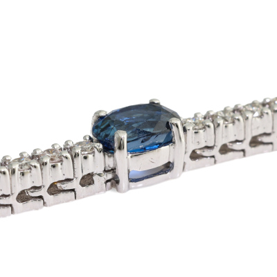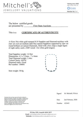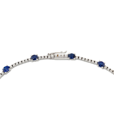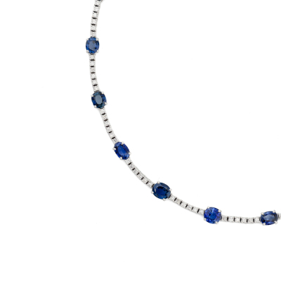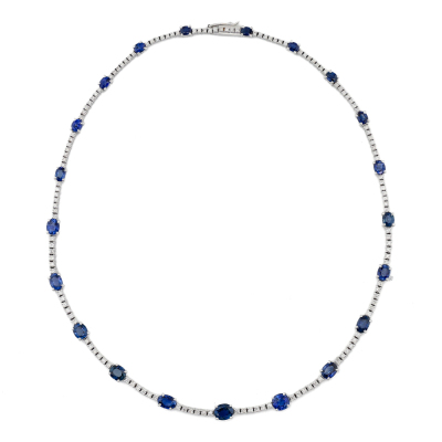 Sapphire and Diamond necklace with 21 graduated oval shape Natural blue Sapphires totalling 14.56ct and round Natural Diamonds totalling 2.44ct (Estimated grading: HIJ SI). 18ct white gold with 18ct white gold box clasp and 14ct white gold tongue (XRF tested, stamped 'K18'). Length: 42cm. Weight: 30.0g. With Certificate #422443. (As New)
