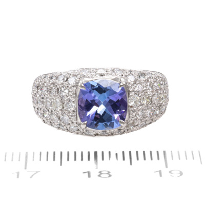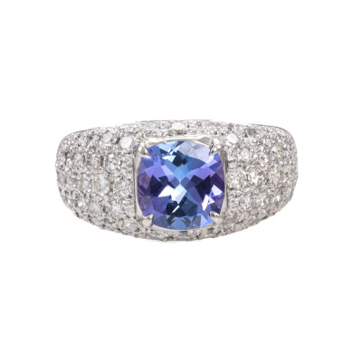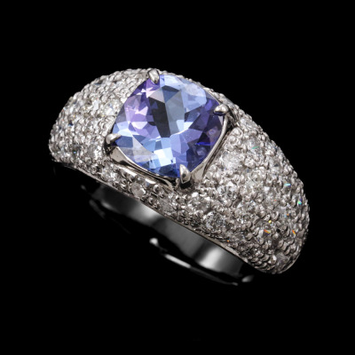 Tanzanite & Diamond ring with centre cushion cut Natural Tanzanite of 1.45ct and round Natural Diamonds totalling 1.19ct (Estimated grading: G VS-SI). Platinum -900. Ring size M1/4. Band width: 4.0mm - 6.0mm. Weight: 9.5g. (Pre-owned)
